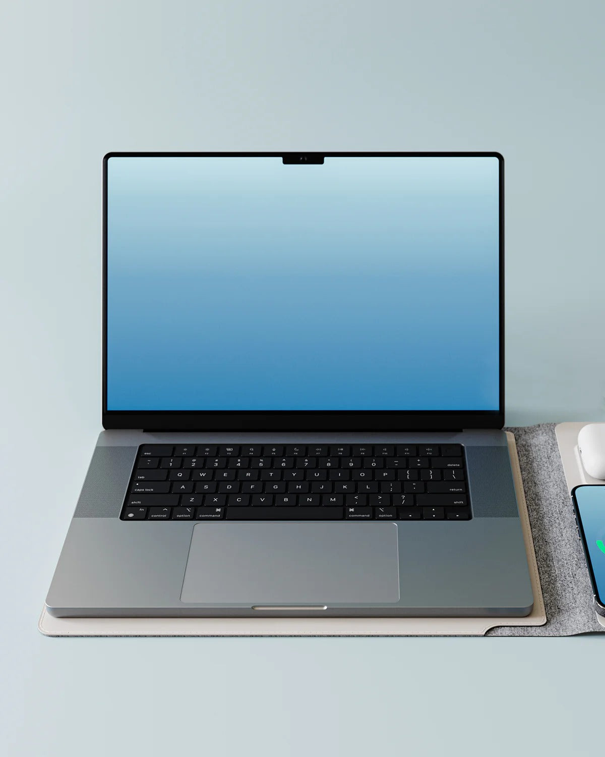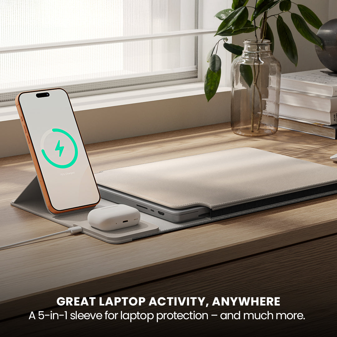 - ChargeSleeve™ Regular — A sleek laptop sleeve that unfolds into a smooth desk pad with built-in wireless charging.